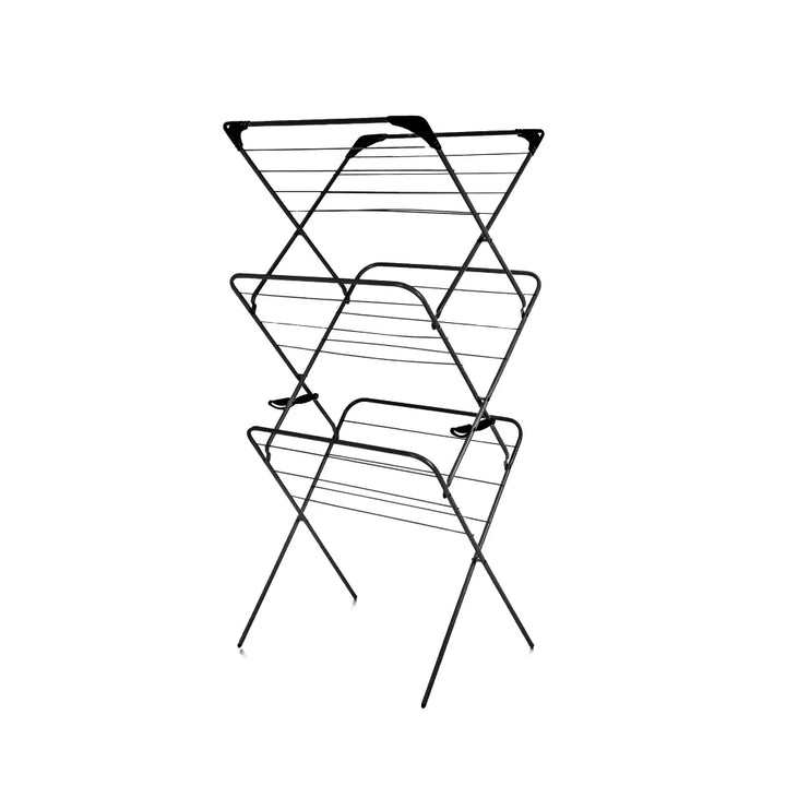 The Minky 3 Tier Essentials Indoor Airer - Black makes indoor drying simple and efficient. With a generous 14 metres of drying space, it’s perfect for everyday laundry. The shaped corners are designed to hold up to 4 extra hangers — ideal for shirts and delicate items. Designed for convenience, it’s sturdy, easy to use, and folds away neatly when not in use.