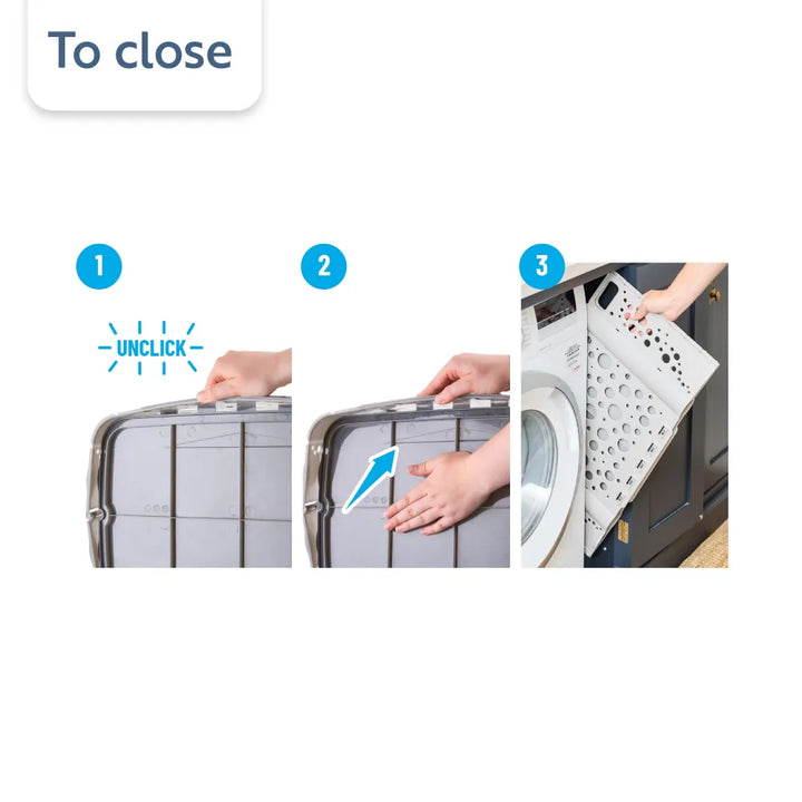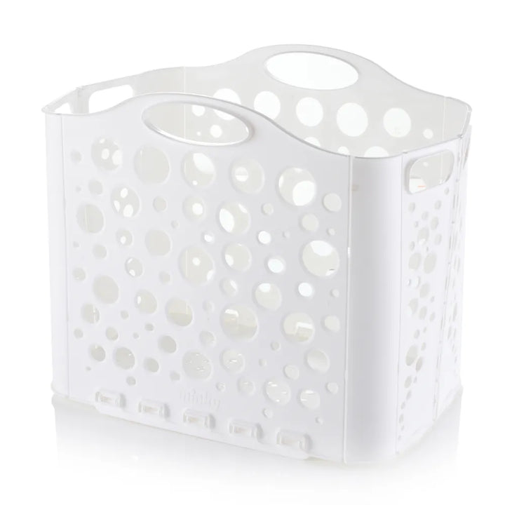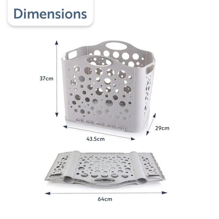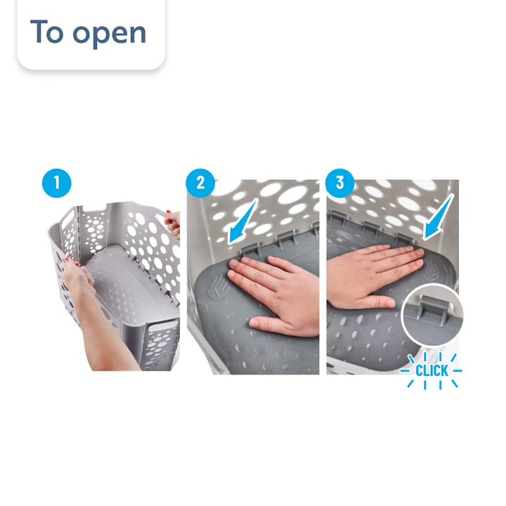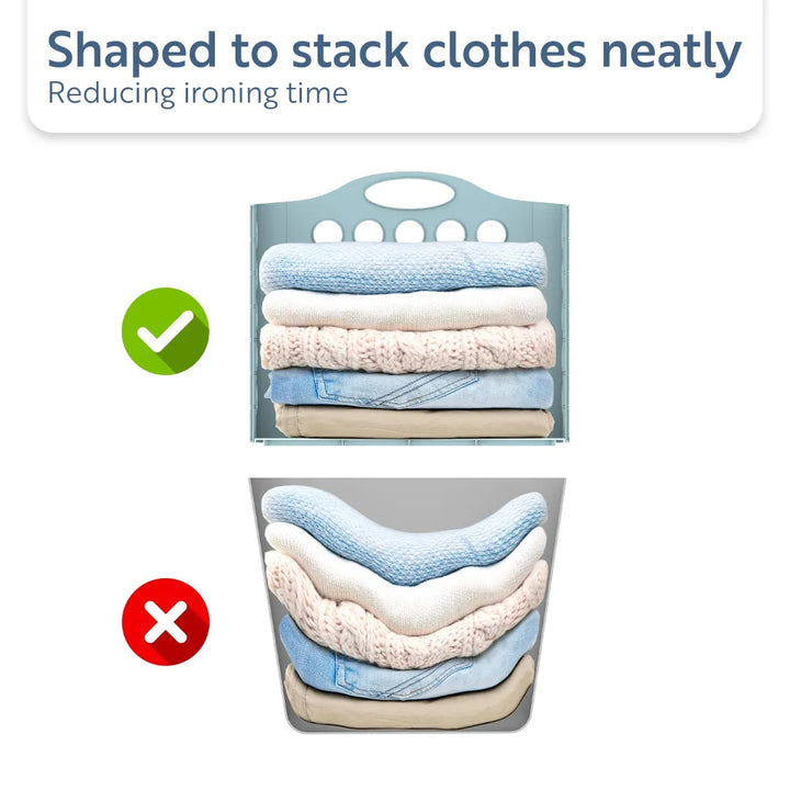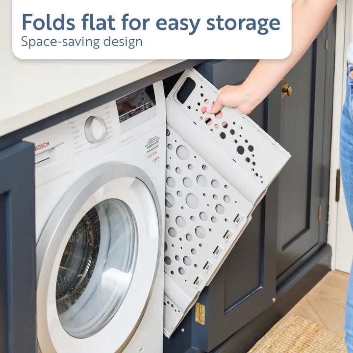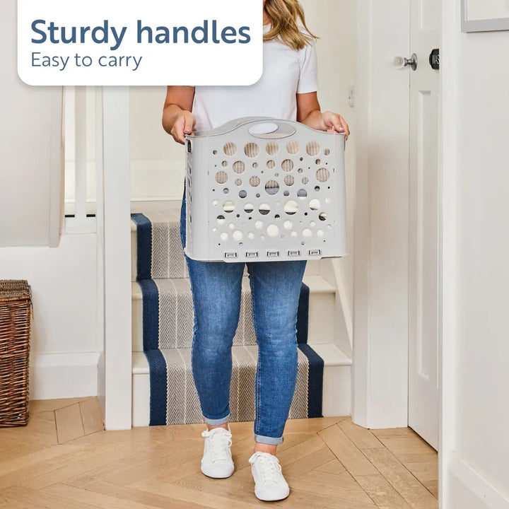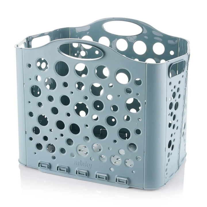 Minky Flat Store Laundry Basket folds flat for easy storage, saving space in your home. Its straight stack design keeps clothes neatly piled, reducing ironing time. Perfect for holding 1-2 wash loads, it can be stored next to your washing machine or in a cupboard. With convenient carry handles, transporting laundry is simple and hassle-free. IMPORTANT: Always place on a solid surface to open and close.