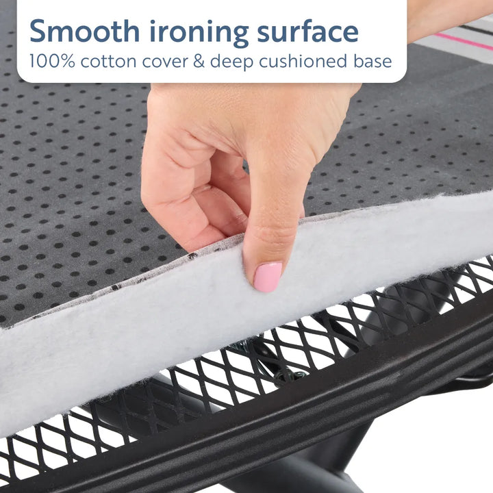 The Minky MaxiPro Ironing Board offers a superior ironing experience, featuring an extra large 135 x 46cm ironing surface, perfect for larger garments & bedding. A high quality, 100% cotton cover gives added durability & includes an integrated scorch-resistant parking zone to let you safely park your iron when repositioning clothes. The smooth, ultra-deep cushioned base lets you glide through creases with ease. Perfect for both steam generator & traditional irons, wheels make manoeuvring hassle-free. With 7 adjustable height settings up to 97cm