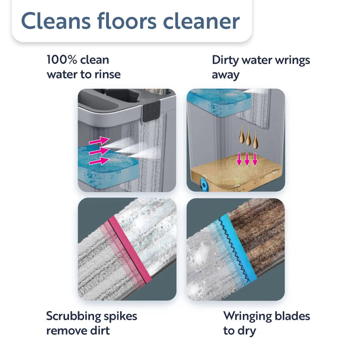 Designed with scrubbing spikes to remove dirt from the mop pad and wringing blades to dry, it delivers a thorough floor cleaning experience.