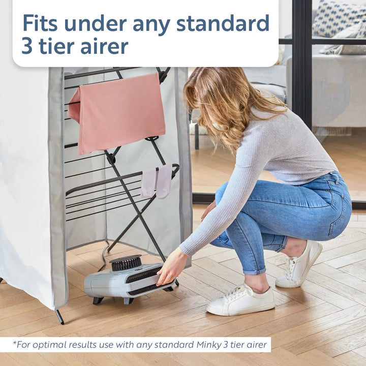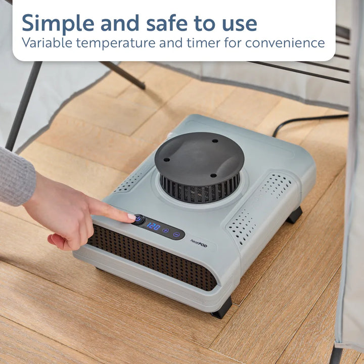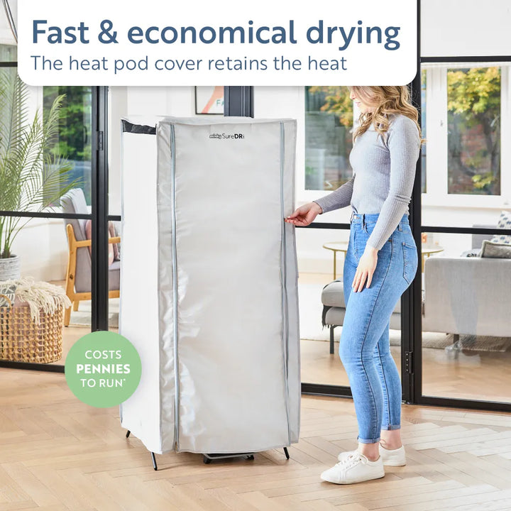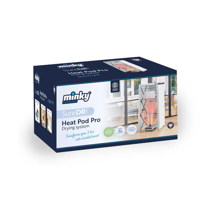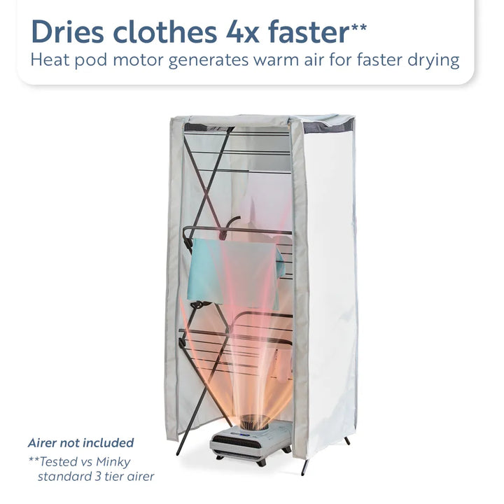 Transform your standard 3-tier airer into a heated airer using Minky's SureDRI® Heat Pod Pro. Say goodbye to damp laundry – it dries clothes 4x faster* while costing just pennies to run**. Easy to set up, the Heat Pod Pro will fit any standard 3-tier airer, which many people already have in their home. Kinder to clothes than a tumble dryer, the heat pod pro generates warm air for fast, efficient drying with variable temperature and timer settings for ultimate convenience. The specially designed cover retains the heat and speeds up drying.