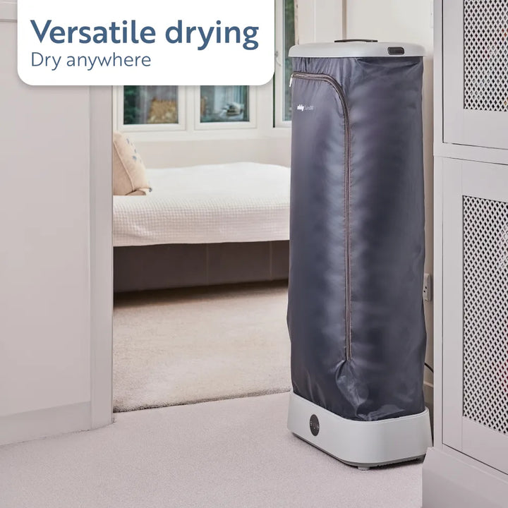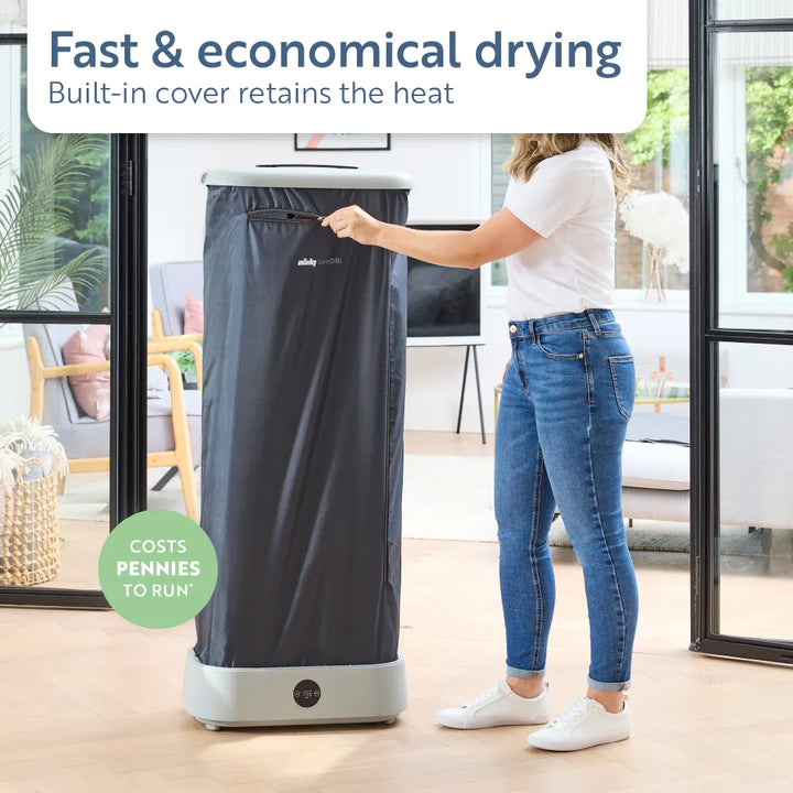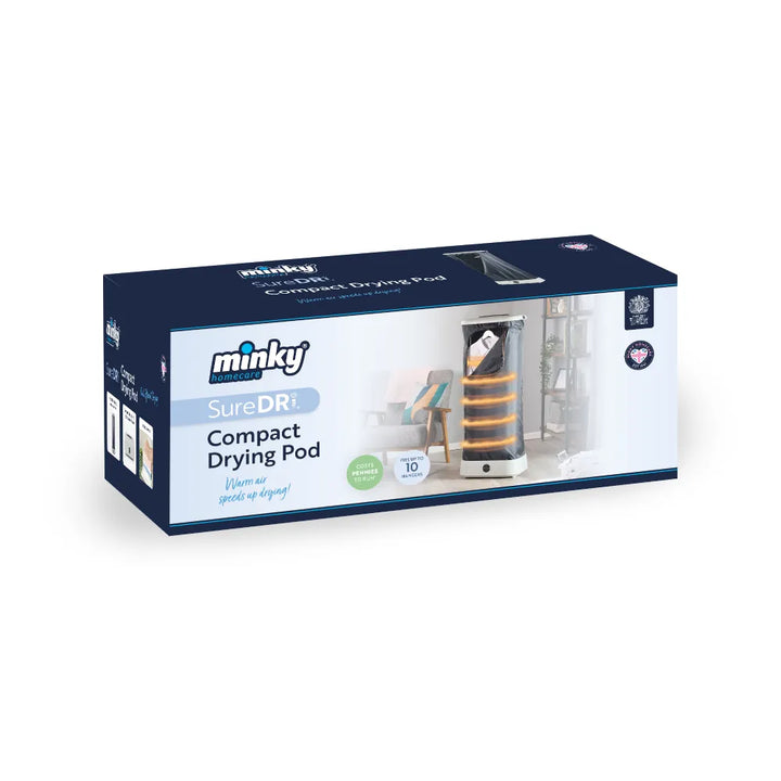 Speed up drying with the Minky SureDRI® Compact Drying Pod! With capacity for 10 hangers, its integrated fan quietly circulates warm air for faster drying whilst also reducing creases - saving more time for you. Kinder to clothes than a tumble dryer, it is quick to assemble with no tools needed and pops up in minutes. Featuring a digital timer for added convenience, the compact foldable design can be used anywhere in your home for fast, energy-efficient drying and is super easy to store.